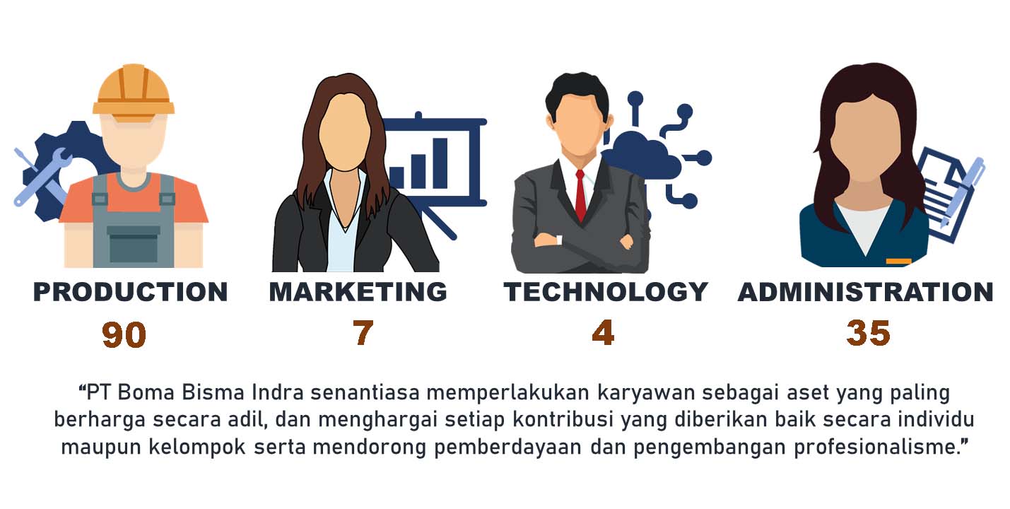 PT Boma Bisma Indra (Persero) memandang Sumber Daya Manusia (SDM) sebagai salah satu pemangku kepentingan yang memiliki peran kunci bagi kesuksesan dan keberlanjutan Perseroan dan memandang SDM sebagai mitra strategis dalam menjalankan usaha. Oleh karenanya PT BBI senantiasa berupaya mengelola dan meningkatkan kompetensi serta menciptakan lingkungan kerja kondusif untuk memastikan kinerja SDM yang optimal, efisien dan produktif.